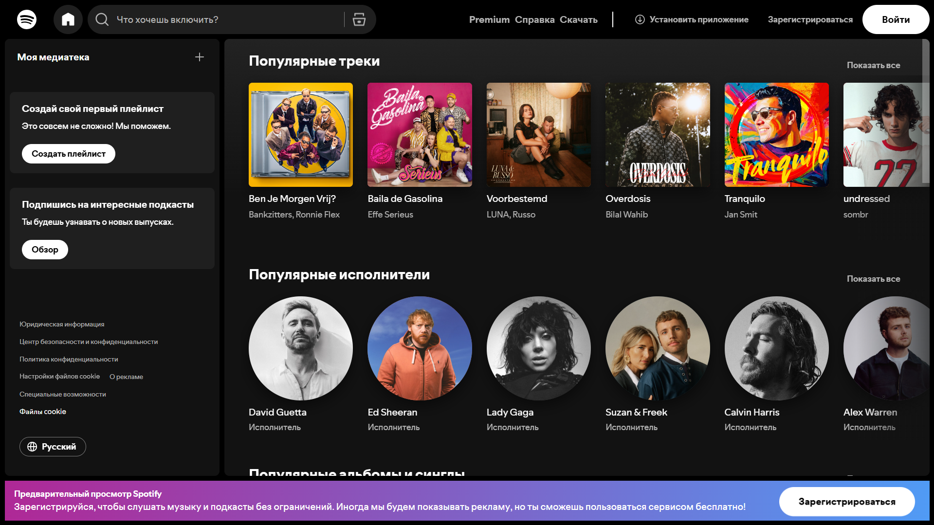 Чтобы наслаждаться музыкой в Spotify, находясь в России, достаточно сменить страну в настройках — тогда сервис будет доступен в базовой, бесплатной версии. Она открывает полный доступ к каталогу, большинство функций работают без ограничений, а слушать можно столько, сколько захочется.