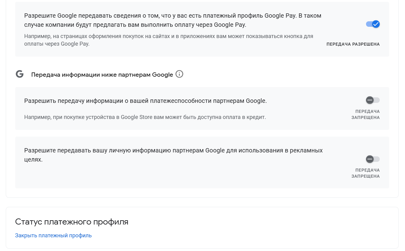 2. Войдите в «Google Платежный центр» под своим аккаунтом. Если ранее вы не совершали покупок и не добавляли карту, выберите пункт «Добавить способ оплаты». Если карта уже была привязана, откройте раздел «Настройки» и внизу страницы нажмите «Закрыть платежный профиль», затем введите пароль.