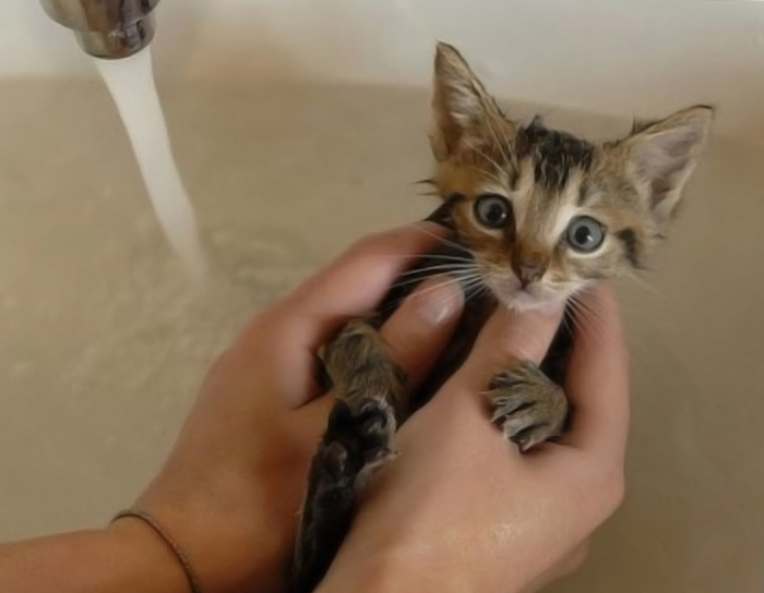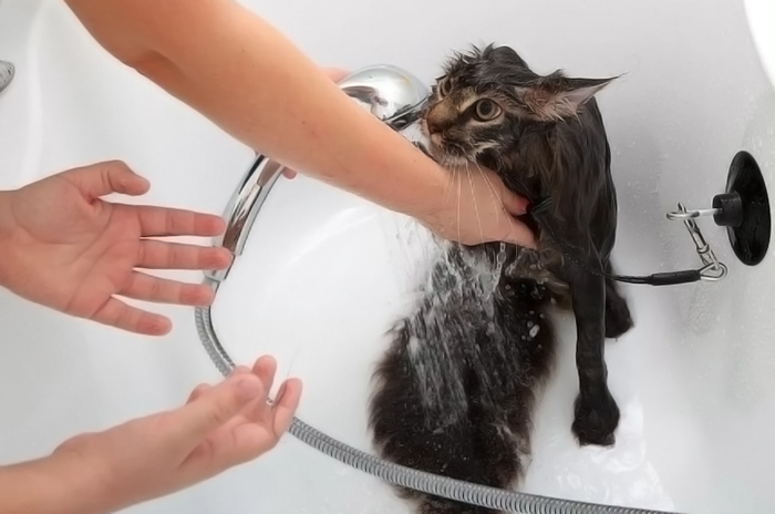 Если кошка доверяет хозяину, то позволит опустить себя в воду, взяв за брюшко двумя руками. При плохом контакте с хозяином и боязни воды животным, держите его за шкирку.