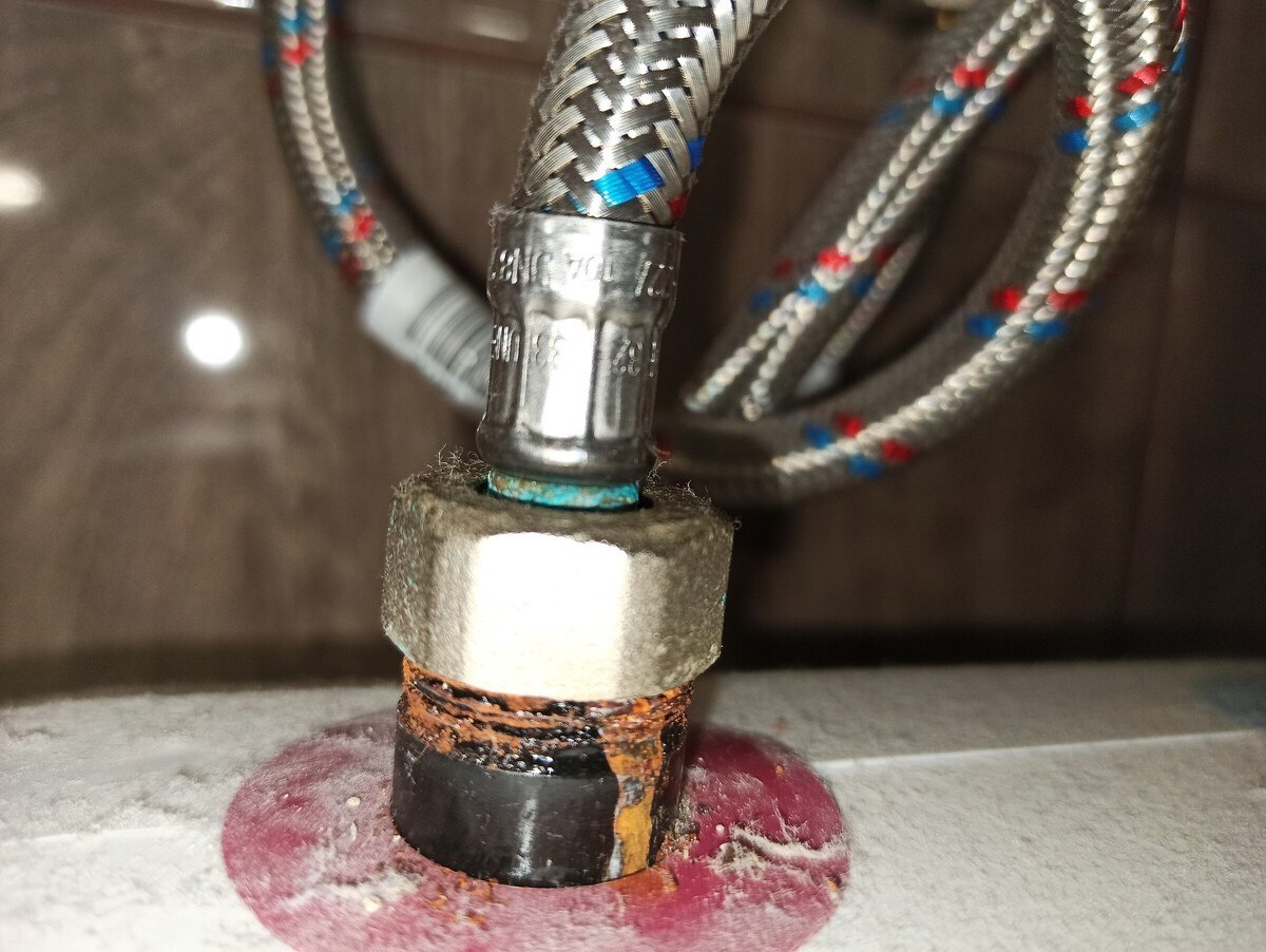 Бывает так, что отгнивает резьба на штуцере гибкой подводки. Причиной служит так же: низкое качество, брак.