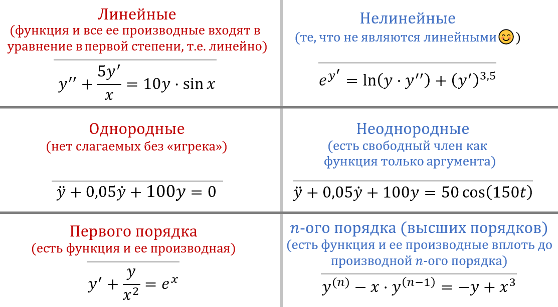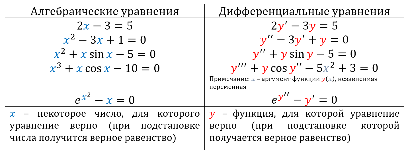 Дифференциальное уравнение - это уравнение, неизвестная в которой является функцией. И как вы понимаете, в таком уравнении у нас будет не только функция, но и ее производные. Довольно похоже на обычные уравнения, где икс нужно найти, отличие в том, что в обычных уравнениях из школьной алгебры икс это какое-то число, при котором мы получим верное равенство, а в диффурах икс - это функция, для которой также мы получим верное равенство. Давайте взглянем на несколько таких: