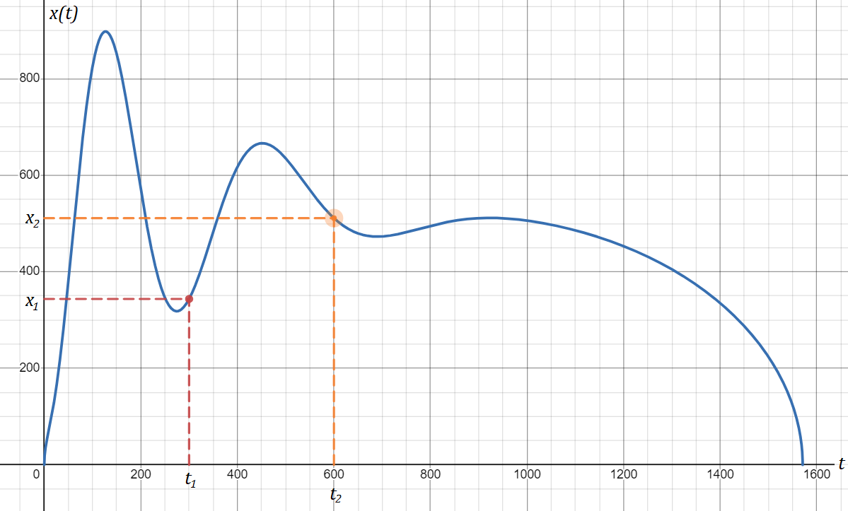 Вернемся к нашему мотоциклисту и выберем какой-нибудь момент времени. Я его буду обозначать как t1. В этой же точке мы, используя нашу функцию x, можем определить координату мотоциклиста, обозначим ее за x1. А теперь мы выберем второй момент времени t2 и аналогично вычислим значение функции в этот момент времени (и обозначим за x2). А теперь мы разницу между x1 и x2 разделим на разницу между t1 и t2. Что же мы получим - а мы получим скорость (v = (x2 - x1) / (t2 - t1)). Ну почти) Здесь мы использовали подход из равномерного движения: разделить пройденный путь на время. Только тут мы не весь путь на все время делим, а выбираем путь и время за какой-то участок движения. Но подождите, ведь это же не та скорость, у нас здесь движение ведь не равномерное, вон какой график искривленный: