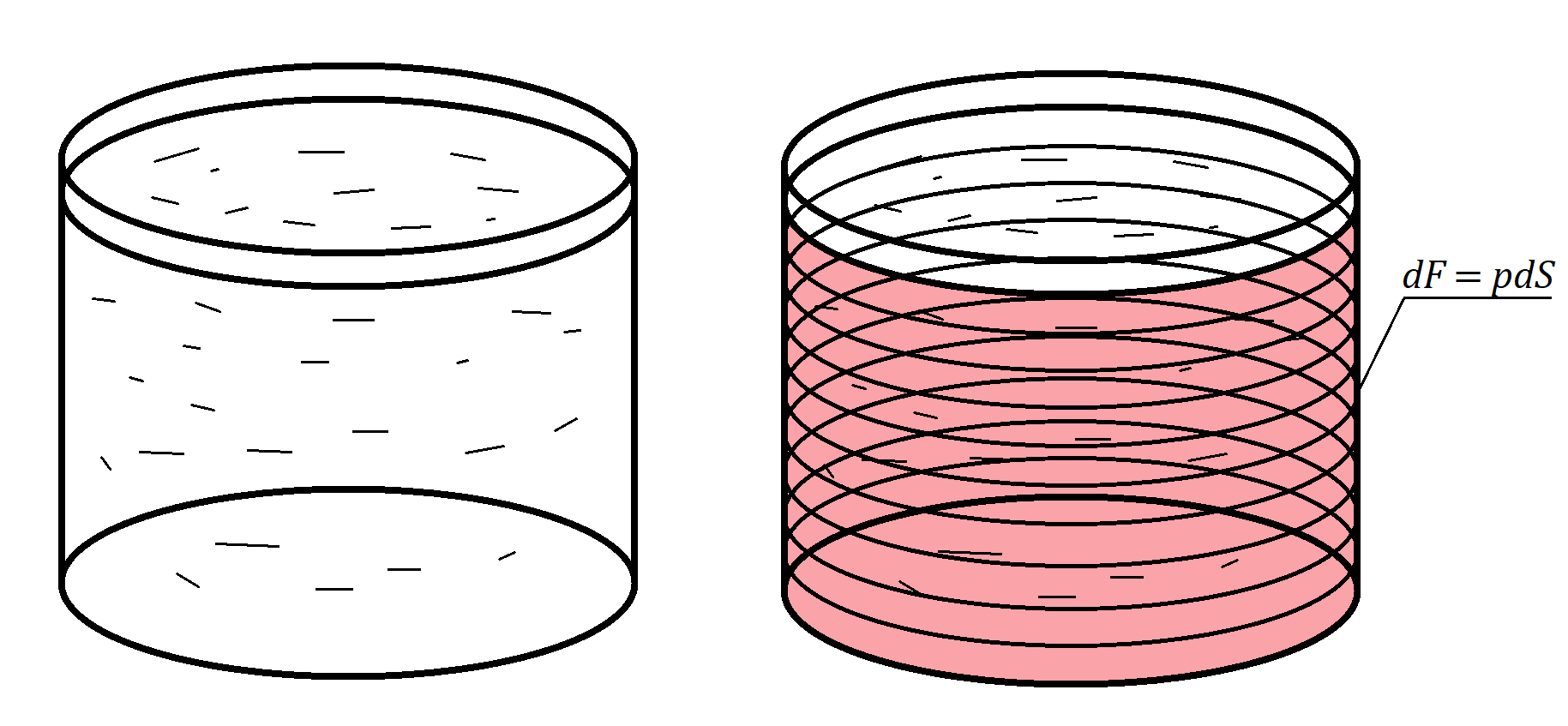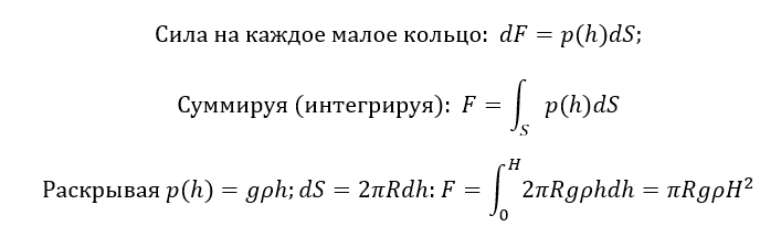 Когда мы разбили сосуд на бесконечно малые кольца, мы можем считать, что на всем вот этом колечке давление постоянно (аналогично тому, как мы делали с производной, масштабируя график и сближая точки). А значит, мы можем рассчитать силу давления на кольцо по простой формуле: умножим давление на этом кольце на его бесконечно малую площадь. Теперь если мы сложим силы с каждого такого колечка (которые тоже бесконечно малые), то мы и получим искомую силу: