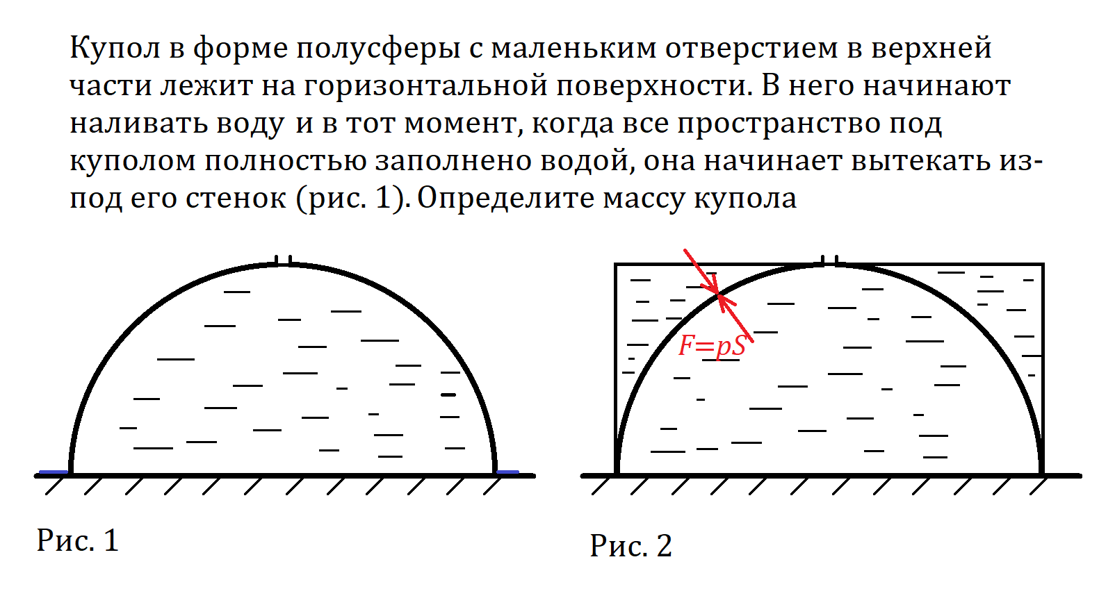 Здесь уже можно простыми методами решить задачу. И решение, конечно, не сказать что и сложное: сила давления воды на купол равна весу купола (так как именно при полном наполнении вода подтекает), при этом если мы мысленно поместим воду над куполом (см рис. 2 на картинке выше), то на стенки купола обе воды будут давить одинаково, разве что в разных направлениях (чтобы понять это, можно представить маленький участок сферы как плоскость), то есть вес купола - это вес мысленно добавленной воды над ним. Остается посчитать объемы, и задача решена. В моем рассказе решение может показаться легким, однако придумать его сходу может быть довольно затруднительно. Но матанализ дает нам второй путь, более сложный в вычислительном плане, но более простой в придумывании решения: давайте просто при помощи интеграла посчитаем силу давления, она будет равна весу купола и тогда задача решена. До второго варианта, как по мне, дойти проще