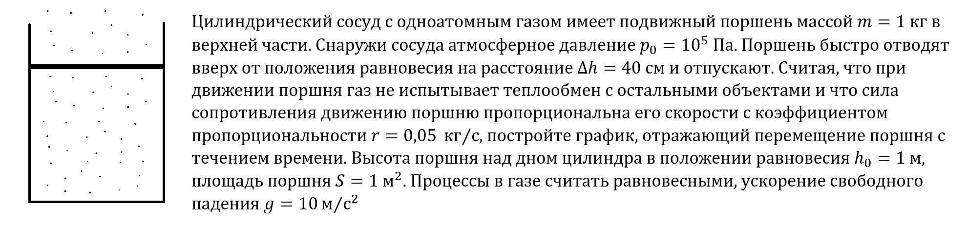 И вот у нас получилось нужное нам дифференциальное уравнение. Добавляя к нему ограничения, то есть начальную высоту цилиндра (дана в условии, сумма высоты в равновесии и расстояния, на которое поршень подняли) и начальную скорость (по условию равна нулю), у нас будет достаточно всего для однозначного решения задачи (по сути, задача свелась к одному дифференциальному уравнению второго порядка, для него нужно два начальных условия, поэтому так).