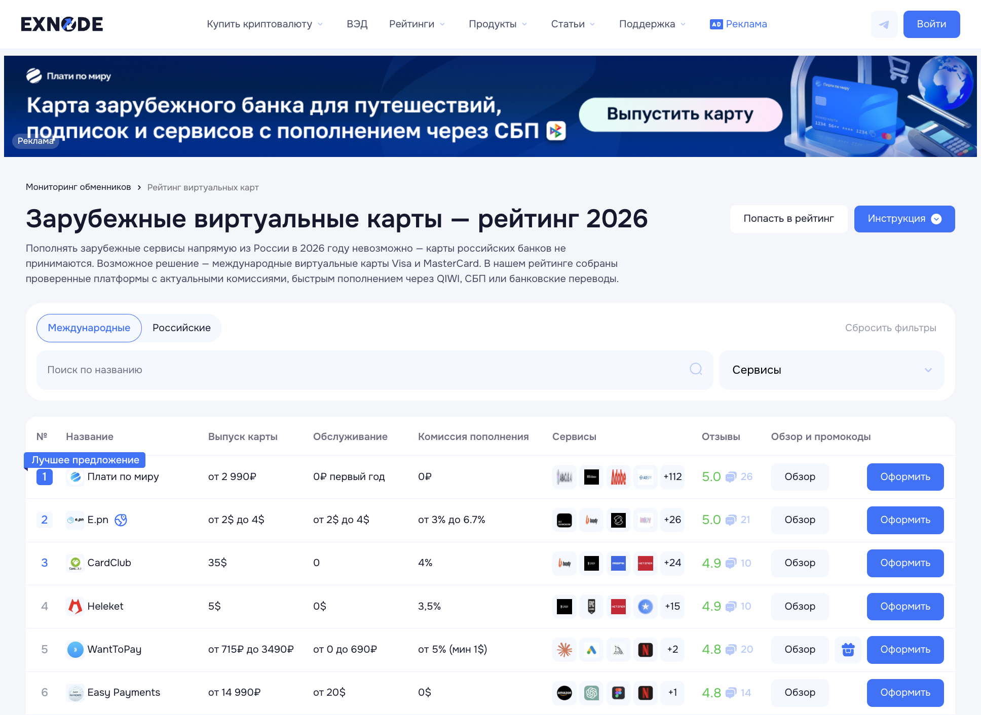 Мониторинг виртуальных карт Exnode делает выбор проще: там вы найдёте сравнения условий, комиссий, рейтинги и отзывы пользователей. Выберите сервис и зарегистрируйтесь. Обычно требуется почта и подтверждение личности. После входа в личный кабинет выбирается выпуск иностранной виртуальной карты.