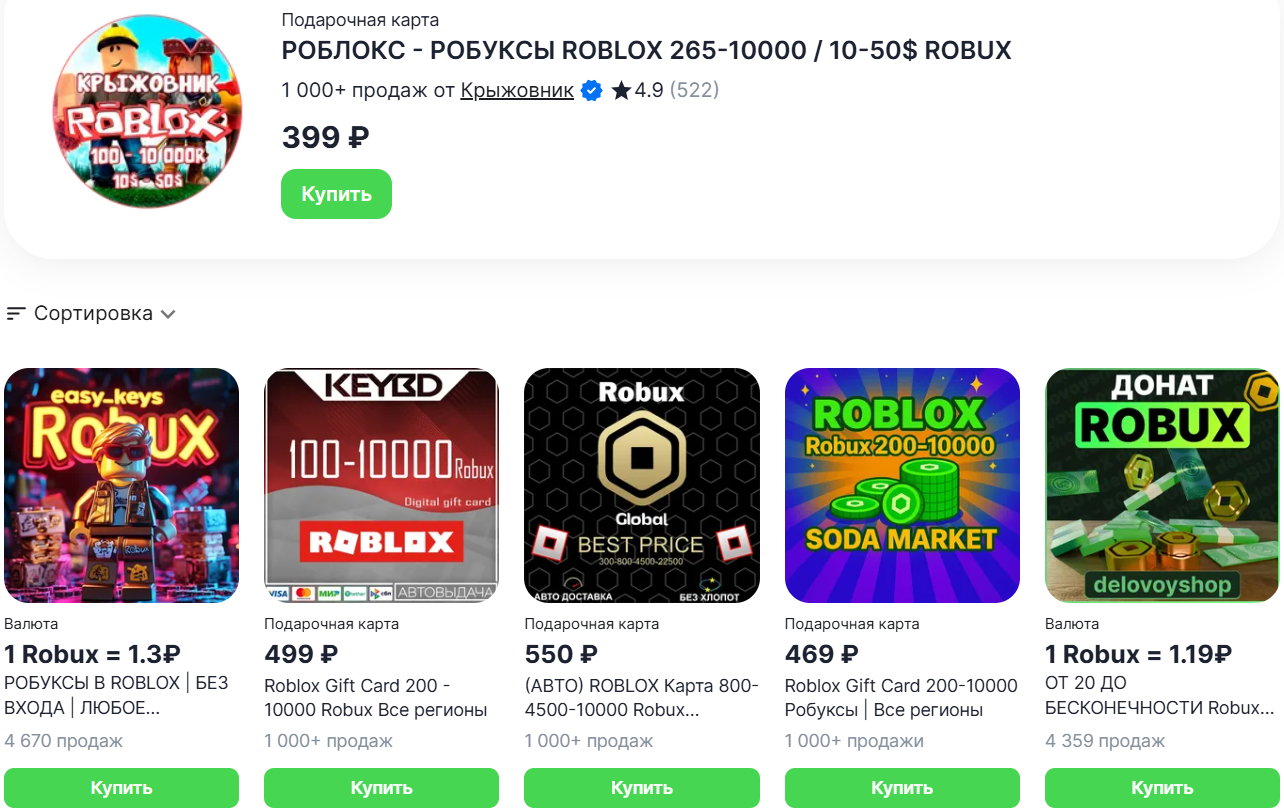 Перейдите на сайт ggsel, введите в поисковой строке «Робуксы».