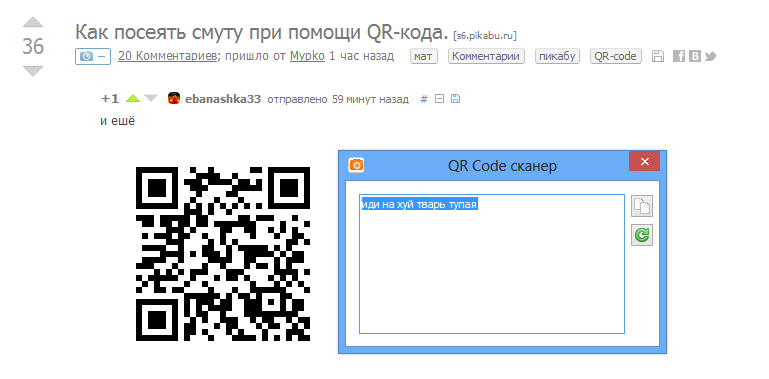 1170 MyNameIsMypka Как посеять смуту при помощи QR-кода. 11 лет назад Мат Комментарии Пикабу QR-код