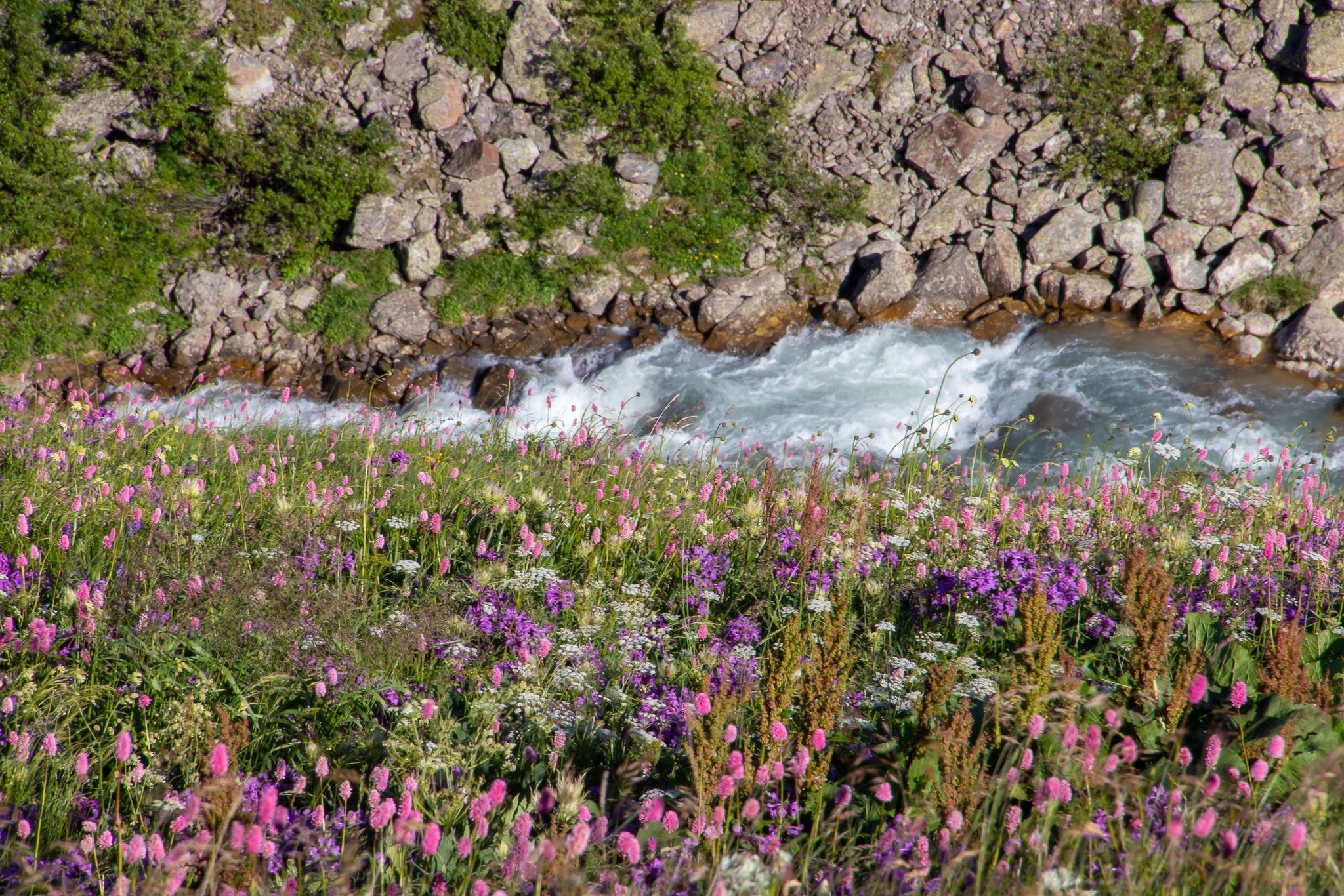 2. Река Донгуз-Орун-Баксан. Чтобы посмотреть на неё, озеро Донгуз-Орун-Кёль и чудесные цветущие склоны, нужно чуть-чуть пройти в сторону со средней станции канатной дороги на Чегет.