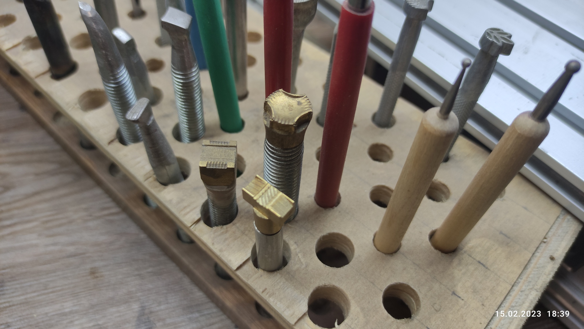 Сверлилки обычные. В стойке стоит еще одна бормашина (Профиль) использую при работе с кожей при сверлении дырок в ножнах. Пробойниками сейчас не пользуюсь вообще.