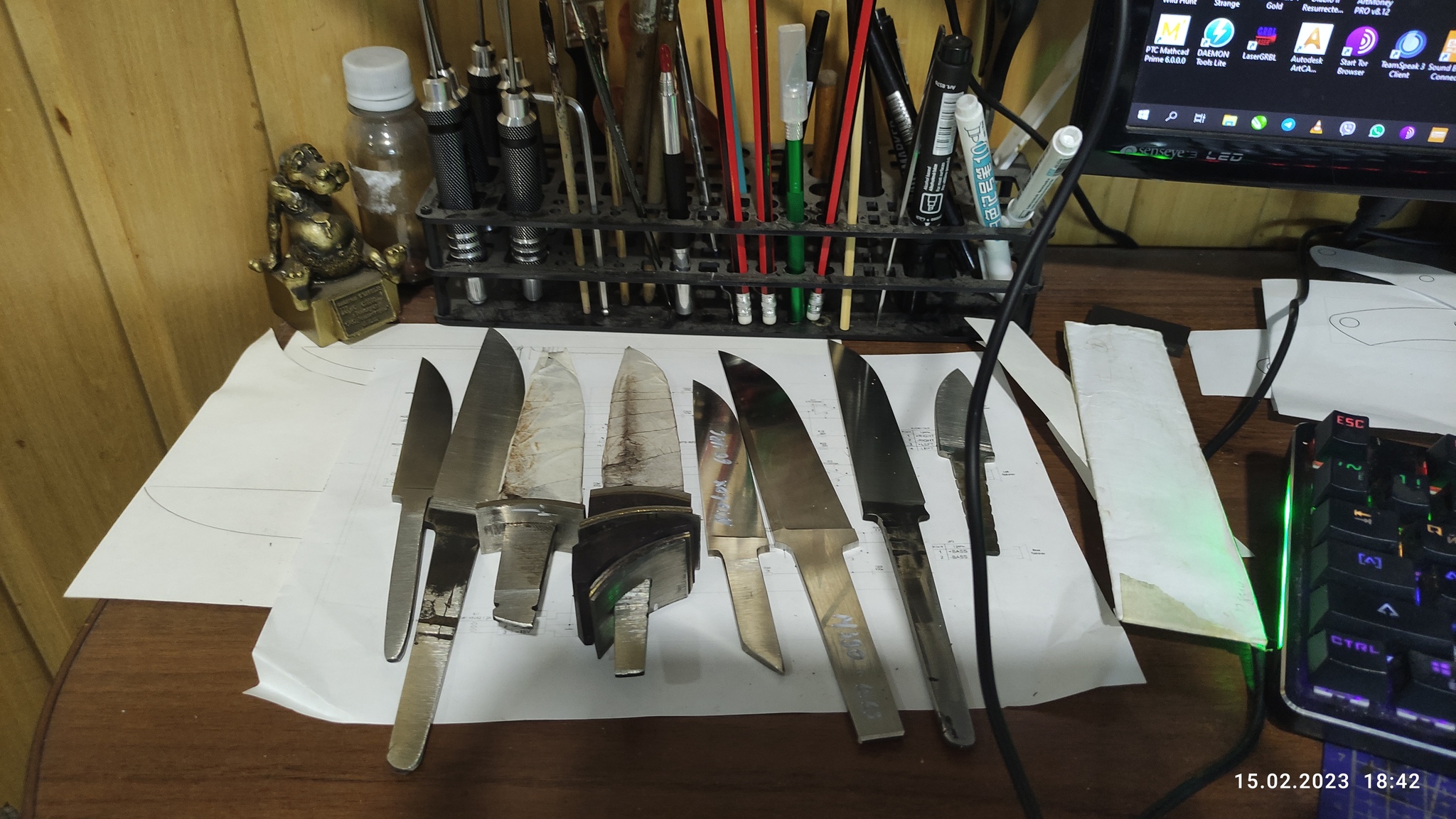 Клинки ждут своей очереди. Последний год слесарю сам, до этого покупал готовые или заказывал по эскизам. Делаю правда медленно, после работы времени не много остается. Хотя если находит вдохновение, то и в 3 дня ножи делал. В целом делаю не только ножи, часто из титана что-нибудь поточить приятно и раскрасить, из дерева какие-нибудь безделушки. Мелкий потихоньку приобщается, то кораблик ему выточи, то пиратскую саблю для костюма ))