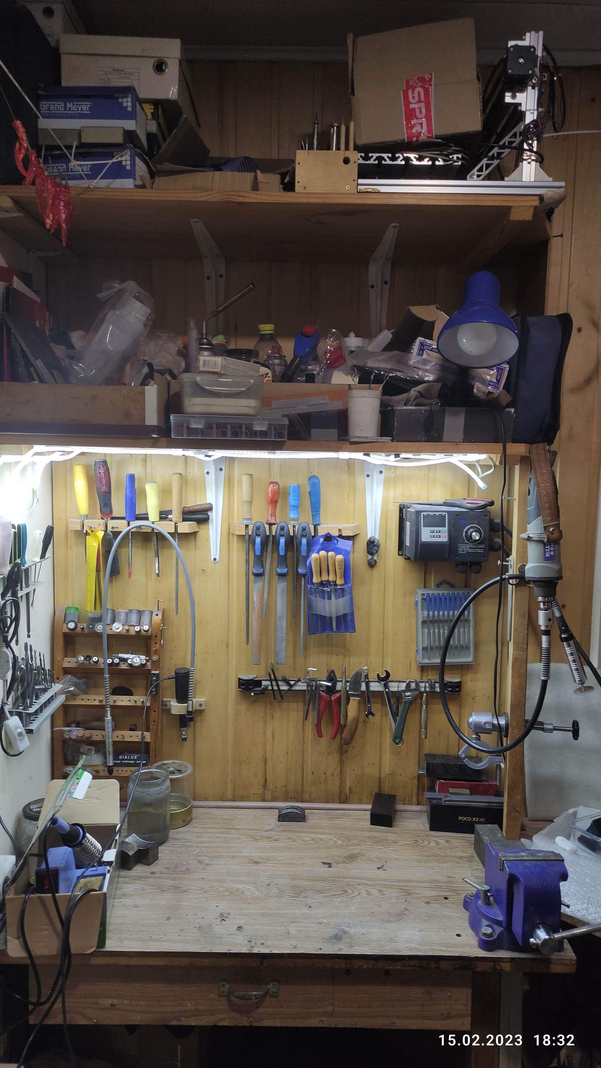 Проще говоря с обной стороны стол и инструмент, с другой комп и склад, ну плюс заточное оборудование тут же.