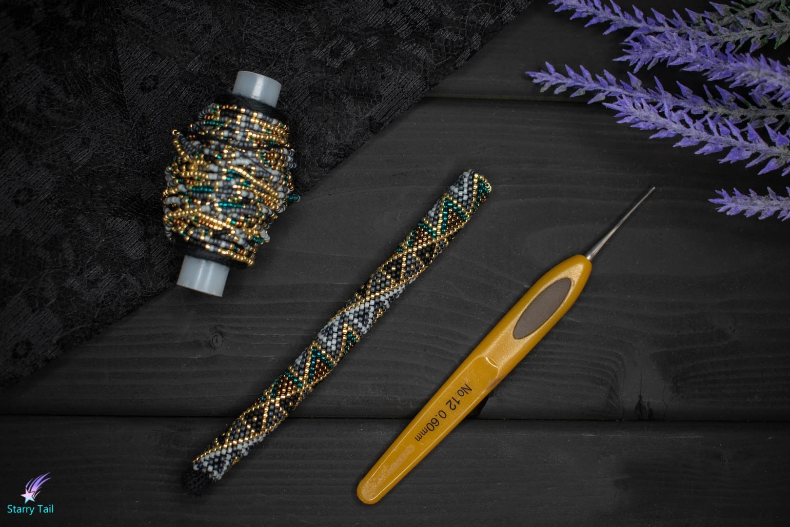 Я выбрала два вида метализированного бисера, огонёк цвета морской волны, два оттенка серого и чёрный.