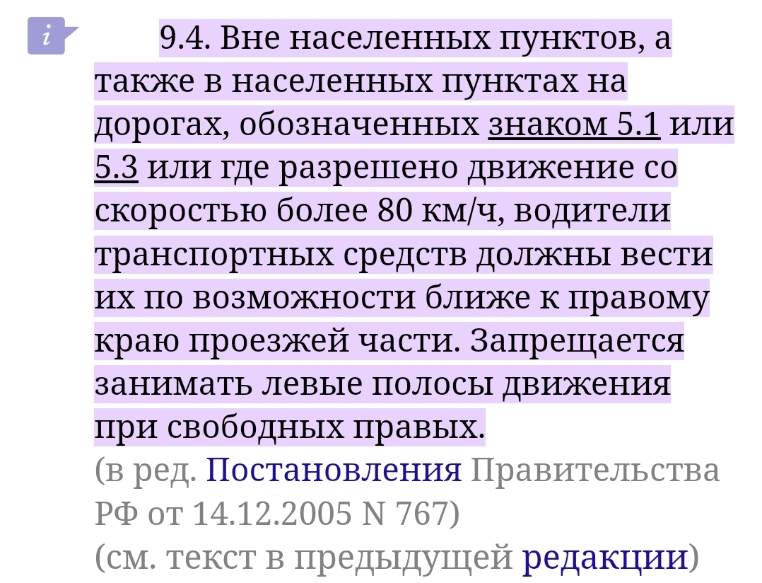 И вот тут возник вопрос - а на каком основании я должен его пропускать? Я и так еду с превышением, соседние полосы медленнее, для меня перестроение в таком случае вызывает дискомфорт. И если такому умнику прям не терпится, то пусть сам перестраивается вплоть до обочины. Ведь если я при перестроении из-за него попаду в дтп (скорость плохо сбросил или еще чего), то вина целиком и полностью на мне, а тот угонит в закат.