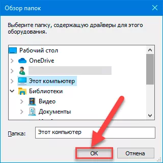 После перехода в нужную директорию во всплывающем окне «Обзор папок» нажмите на кнопку «ОК» и подтвердите выбранный путь к новому пакету драйвера.
