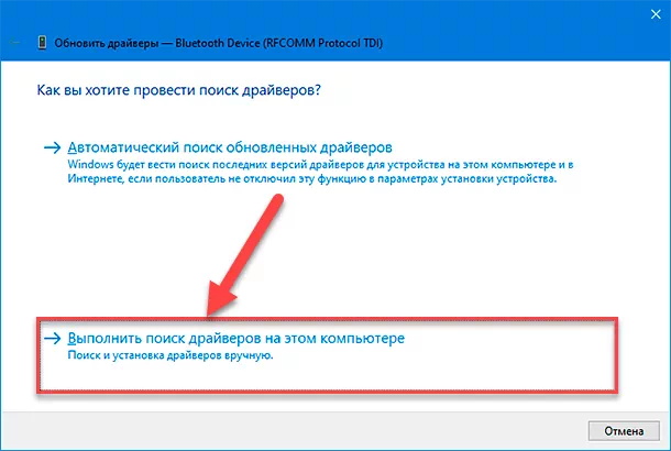 Произведя упорядоченный набор последовательных шагов из предыдущего раздела «Установка драйвера из пакетного массива «Microsoft»», пользователям необходимо, во всплывающем окне службы обновления драйверов отмеченного оборудования, на вопрос «Как вы хотите провести поиск драйверов?» выбрать вариант ответа «Выполнить поиск драйверов на этом компьютере».