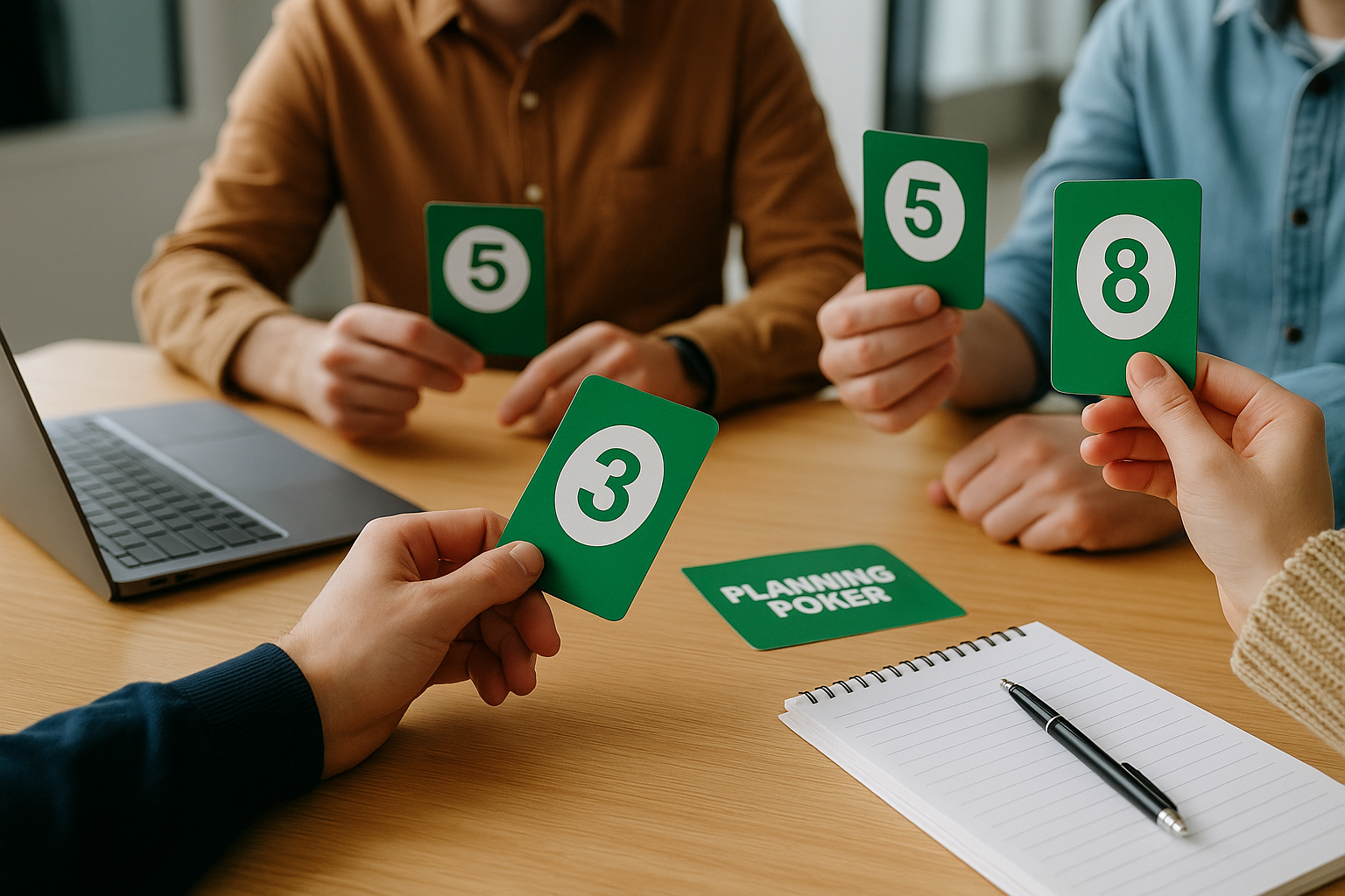 В сессии обычно принимают участие разработчики, тестировщики, аналитики и другие члены команды, которые будут работать над проектом. Для оценки используются карты с числами, например, из последовательности Фибоначчи (1, 2, 3, 5, 8, 13, 21 и т.д.).