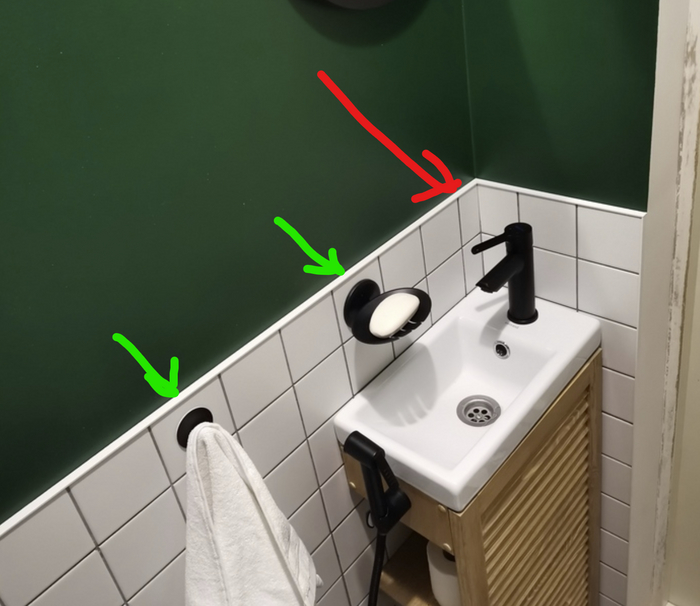 Зелеными стрелками указано правильное! размещение аксессуаров. При проектировании раскладки учитывайте, что все сантехнические приборы должны выходить ИЗ ЦЕНТРА плитки. Для этого выбирайте подходящий формат плитки и размещайте выводы кранов и смесителей в определенных местах.