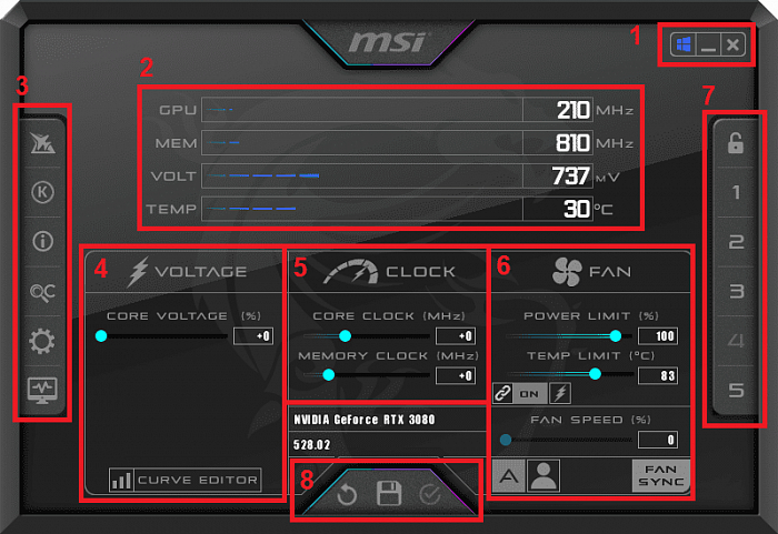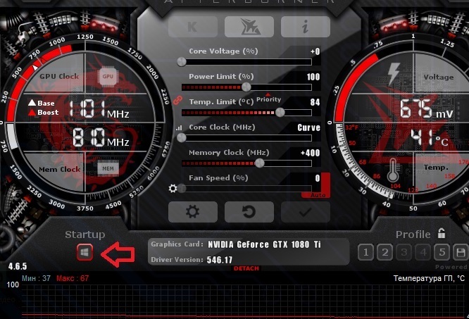 Поэтому обязательно проверяем трей на момент запущенного Афтербёрнера и если он присутствует, то открываем его и сбрасываем настройки кнопкой по центру.