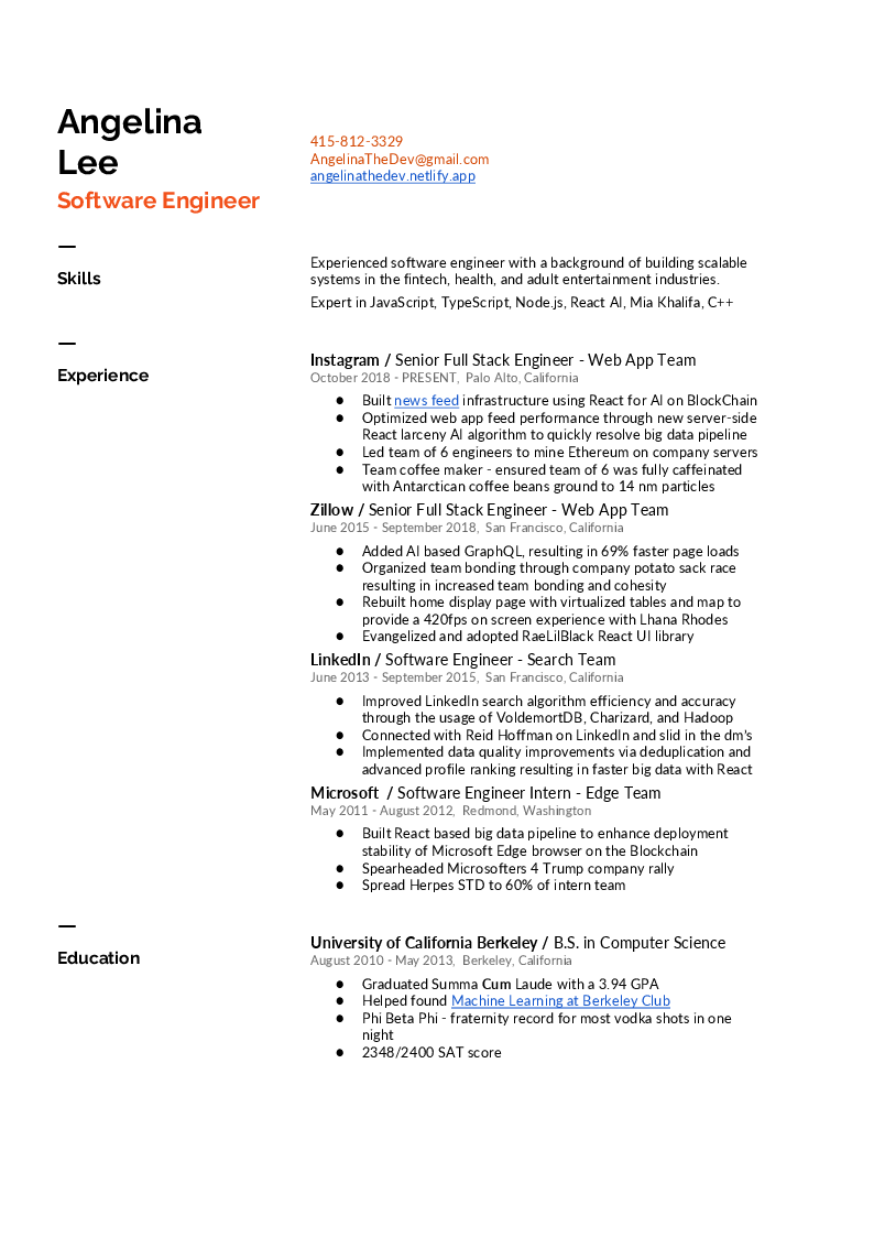 Пользователь Reddit и разработчик ПО AngelinaTheDev составила идеальное с точки зрения хедхантеров одностраничное резюме.