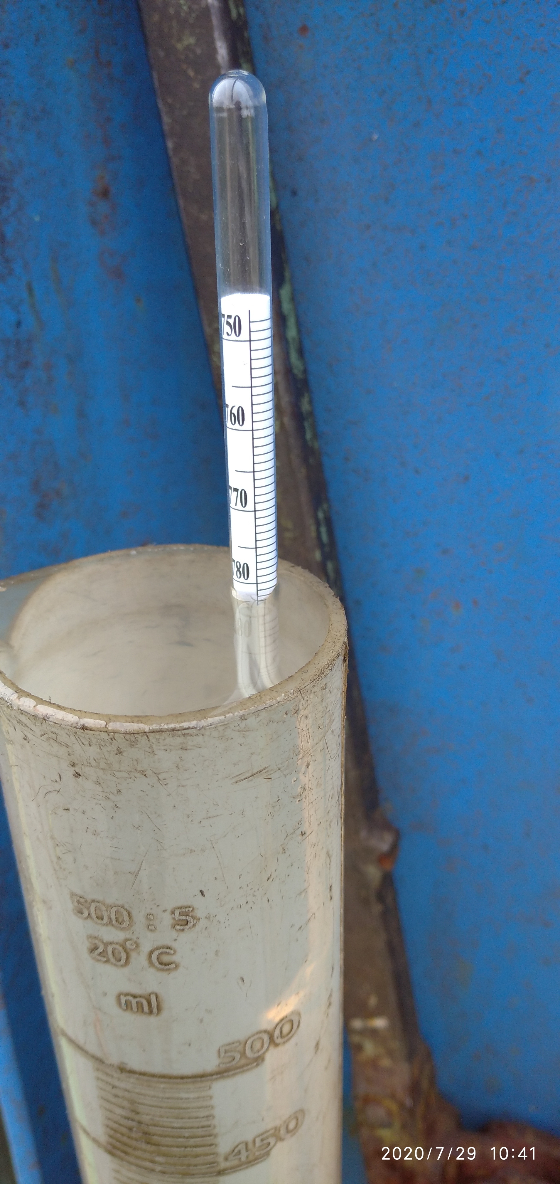 Замер плотности осуществляется погружением ареометра в цилиндр с нефтепродуктом. Замер отчитывается по нижнему мениску(темные нефтепродукты по верхнему мениску, светлые по нижнему. Плотность составла 0,782 г/см3 при температуре +28* С