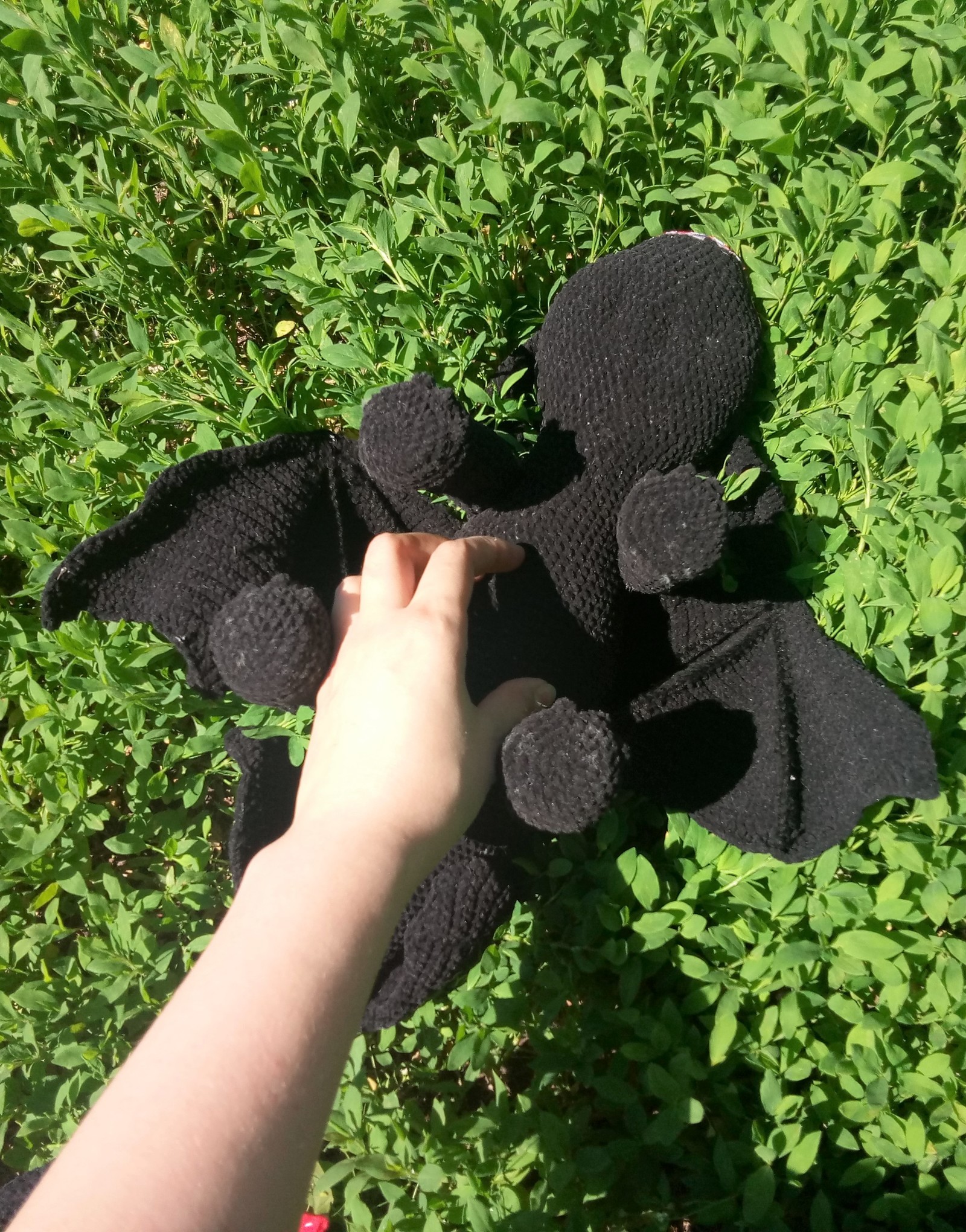 Схем на него в интернете не много, да и заказ был на реалистичного дракона, а с этим вообще была беда. Поэтому вязала "по выкройке": рисовала деталь на картоне, и через каждые пару рядов прикладывала для сравнения. Для меня это оказалось даже интереснее, чем вязать по описанию, но и сложнее в разы: пряжа оказалась "нераспускаемая", т.е. косяки не исправлялись, а просто всё вязалось заново. Но велюровый эффект того стоил!