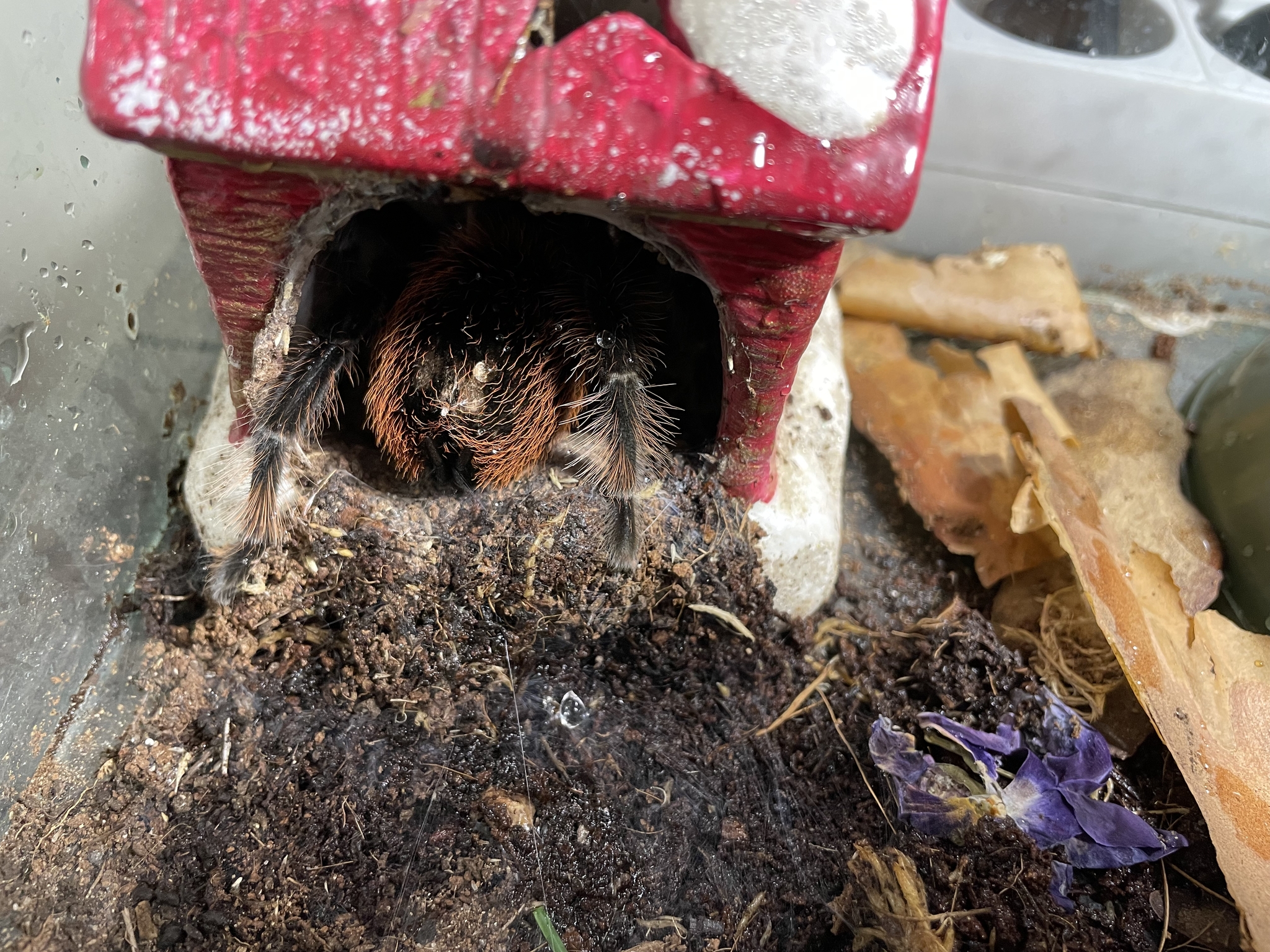 Ибрагим показывает совсем другое: он развел червяков в огородике, иногда копает их и кушает. Он признал старый подсвечник домиком (ставили ему для фотосессии новогодней) и спать, линять или в случае опасности скрывается именно там. Он построил себе «дачу» из говна и палок - тусит там иногда по ночам.