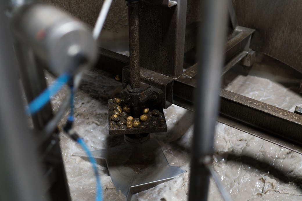 Из бинов картофель попадает на следующий участок, на котором картофель моют и отделяют от посторонних загрязнений, камней и щепок. Очистка происходит в большой ёмкости — внутри неё установлен барабан, на который с помощью форсунок попадает чистая вода. Затем избавляются от кожуры с помощью установки круглой формы: попадая в неё, клубни вращаются вокруг шершавых стенок, и кожура стирается. Происходит это всего за 90 секунд.