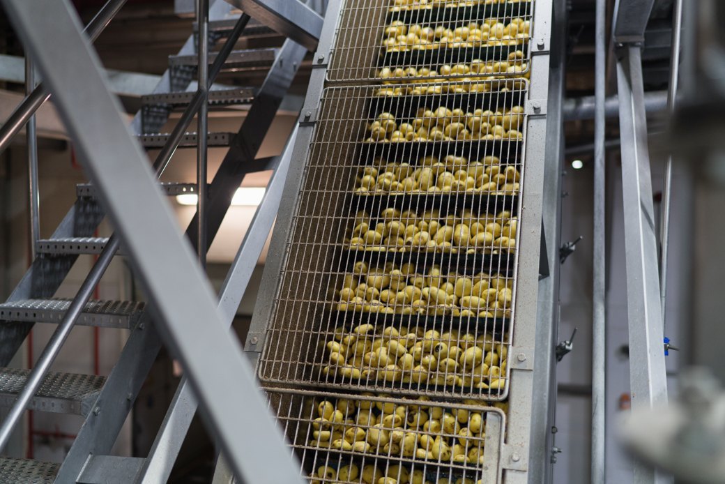 После этого картофель снова моется в специальных ваннах, чтобы избежать попадания малейших частичек кожуры после чистки. Затем проходит сортировка по габаритам, и особенно крупные клубни ждёт грейдер — в нём картофель разрезают на несколько кусков с помощью круглых ножей. Особо крупный картофель после режут ещё пополам. Отсортированные клубни попадают на инспекционный стол — сотрудники следят за качеством продукта, вручную режут упущенные машиной куски или выбрасывают неподходящие.