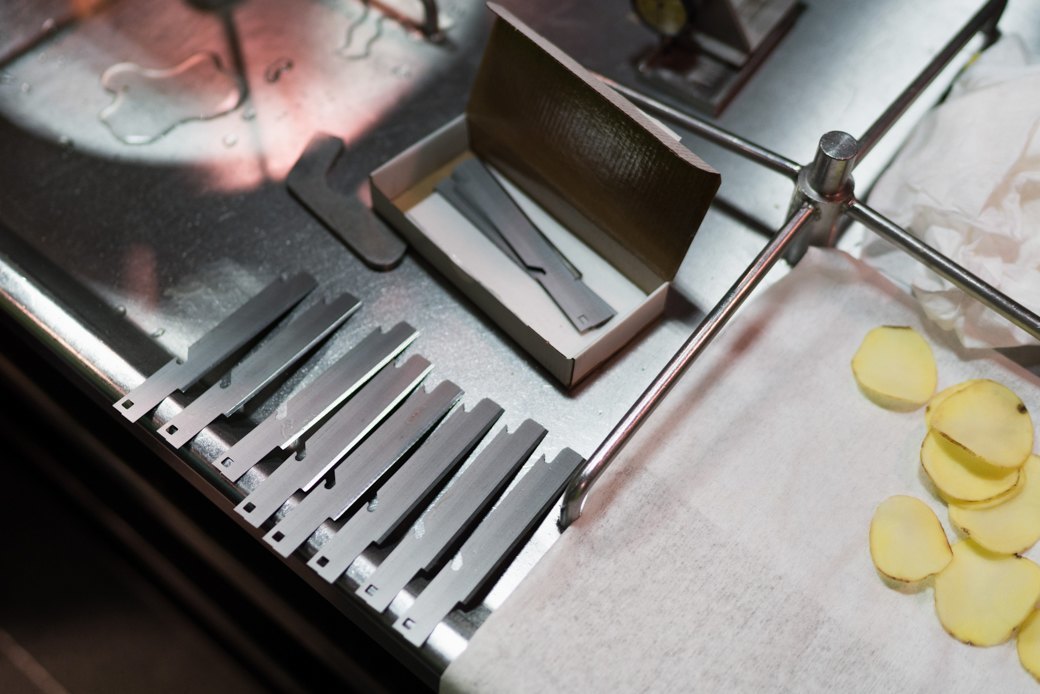После сортировки картофель по системе конвейеров попадает на следующий участок — слайсер, который нарезает клубни на тонкие ломтики: допустимая толщина одного слайса — не больше 1,3 миллиметра. В слайсере установлено пять «голов», внутри которых находятся барабаны с ножами — ломтерезки. Для приготовления гофрированных чипсов ножи меняют на волнистые. Затем слайсы потоком воды перемещают на этап быстрой мойки, где их снова промывают — эта процедура нужна для того, чтобы избавиться от лишнего крахмала. Окрахмаленная вода идёт на специальную установку, где жидкость выпаривают, получая сухой крахмал. Его компания собирает и продаёт.