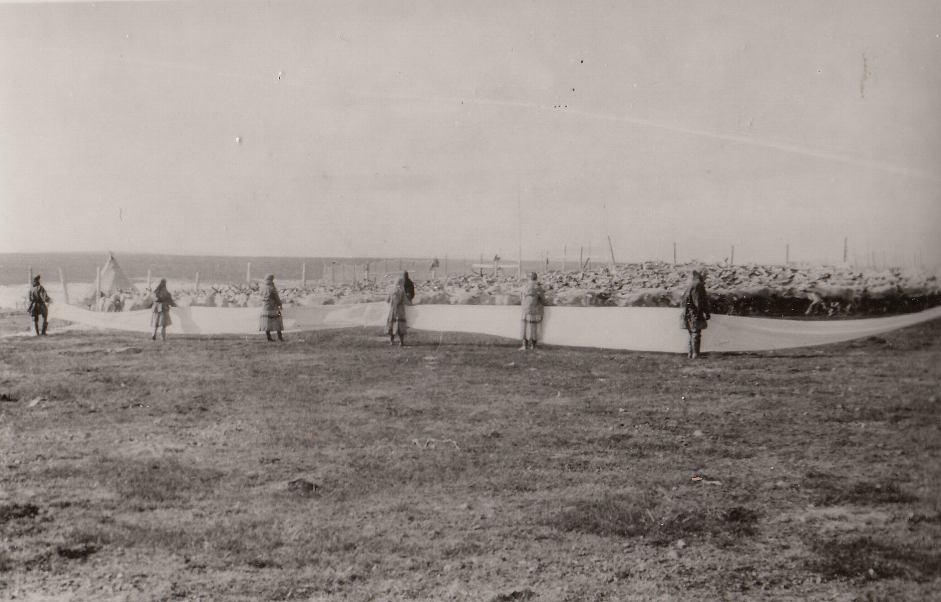 Грузовые нарты (вандеи) ставятся подковой, обтягиваются траловой сеткой, образуя загон. В него загоняются быки, чтобы можно было выбрать нужных. На заднем плане пастухи держат веревки, чтобы быки не убежали раньше времени.
