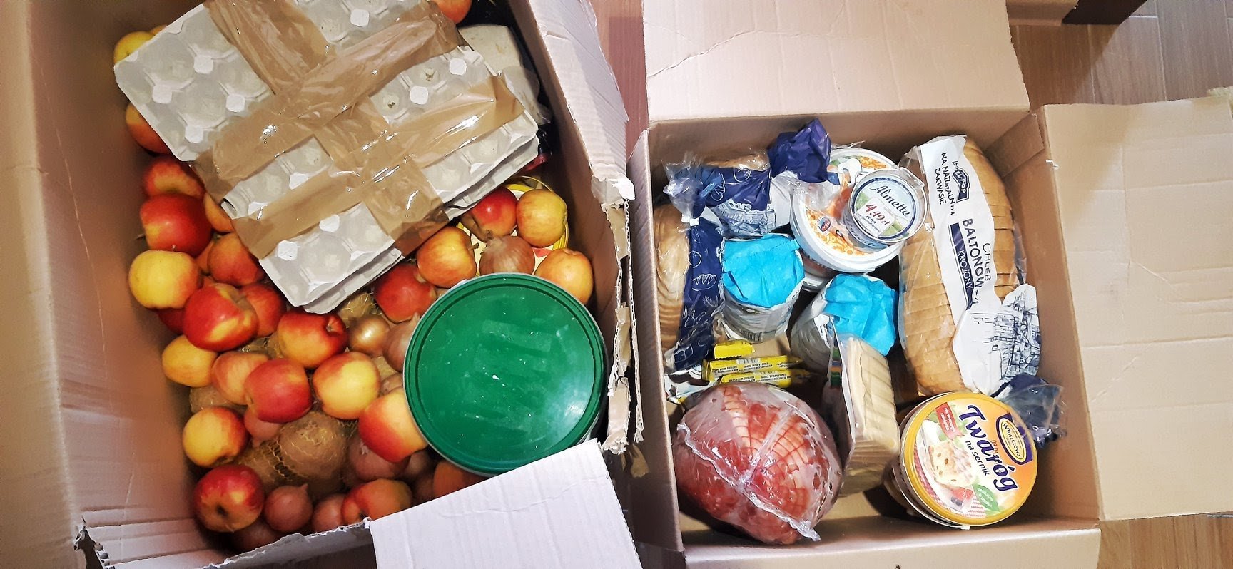 В одной из них находилось: мешок картошки на 15 кг, еще 2 кг лука, около 7 кг яблок, 60 (!) яиц, одна упаковка тортилл на 18 штук, 2 кг ведёрко соленых огурцов, такое же ведёрко с квашеной капустой, упаковка хлебцов и три килограммовые банки йогуртов.