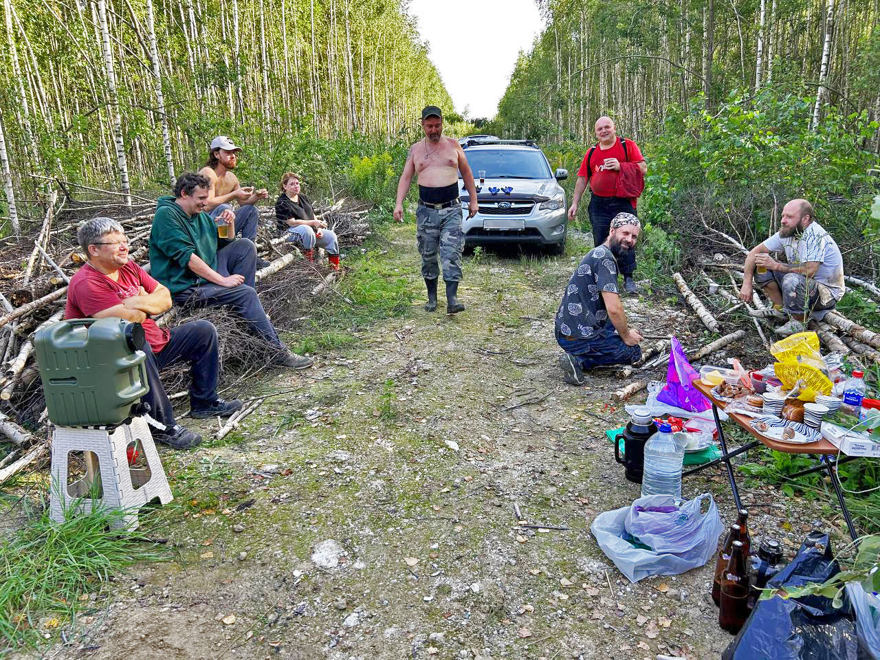 Естественно, таких работников нужно было хорошо угостить! На месте работы был организован полевой буфет с безлимитными бутербродами и печеньками, пиво было закуплено в количестве 12 литров, шашлычок был запечён прямо посреди дороге на решётке, углей я не брал - вокруг сплошной костровой набор из хорошо просушенной берёзы. Также установил канистру с краником, чтобы можно было ополоснуться после ударного труда. В общем, наелись также, как наработались - ударно! За шашлыком с пивом перекидывались мемами и каментами в пикабушном стиле. И что интересно, среди нас не было ни одного хейтера! Даже модератора никто не звал.