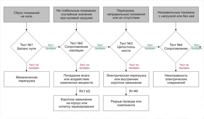 На приведенной ниже диаграмме представлена предлагаемая последовательность действий при тестировании комплекса весоизмерительного оборудования. Для определения места неисправности необходимо произвести измерения на каждом тензодатчике отдельно.