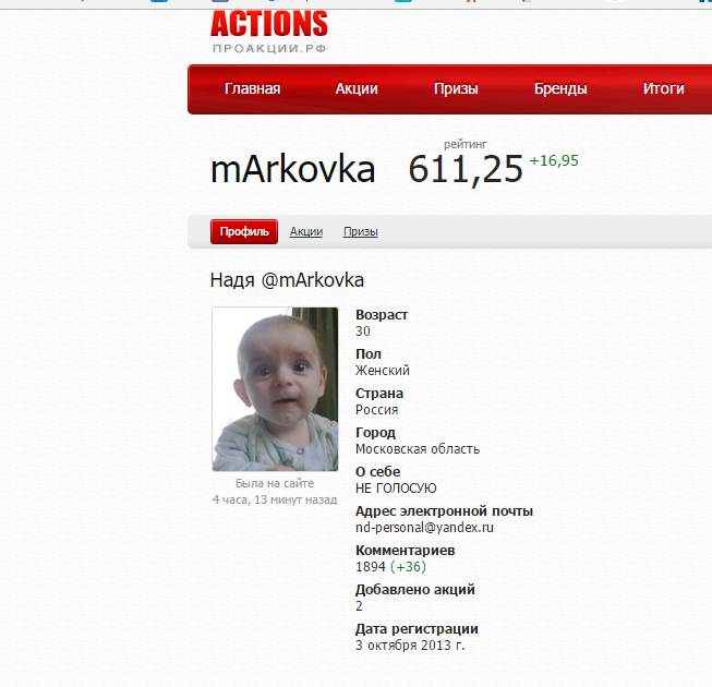 Марковка не так проста, как могло кому то показаться. Этот человек можно сказать профессионально работает над получением любых всевозможных призов, и уж вовсе не безвинная жертва. Вот вам ссылка на профиль на специальный сайт заточенный под акции: http://proactions.ru/~mArkovka.