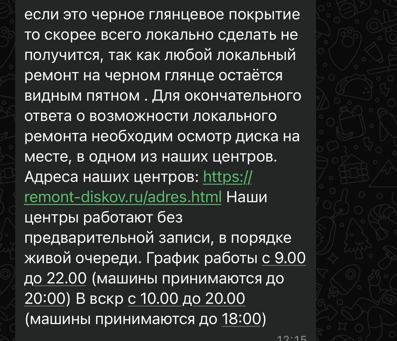 Далее я осмотрел последние два диска, там таких критичных повреждений я не нашел и отнес их в машину. Сразу же я начал искать информацию о том, как подавать претензию и заявление на возмещение за повреждение груза. Официальный бот ПЭКа сообщил мне, что я должен заполнить кучу документов и привезти их лично или отправить почтой в отделение компании. Такой вариант мне не особо подходил, поэтому я позвонил в службу поддержки. Там уже голосовой бот попытался мне рассказать про письменную претензию, но я настоял на соединении с оператором. При этом бот пытался всячески меня отговорить, пугая, что время ожидания оператора более 10 минут. Когда я несколько раз подтвердил, что готов ждать, пошли гудки. Через секунд 5 мне уже ответил оператор. Я все объяснил, он составил обращение и сказал, что со мной свяжутся в течение пары дней, и я смогу предоставить все доказательства.