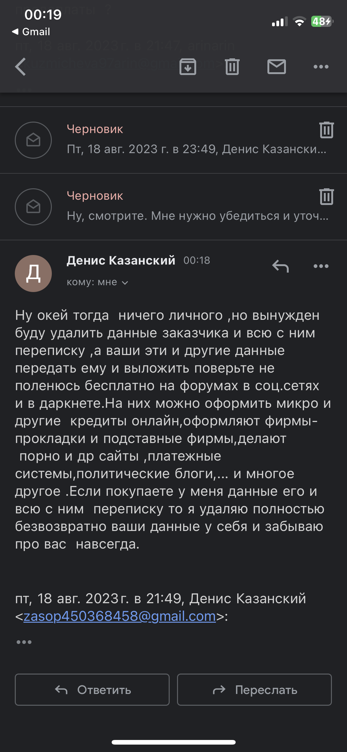 Требую в ответе от него сканы моих доков, чтобы убедиться что мне реально что-то угрожает, на что получаю детский лепет и тухлые газики