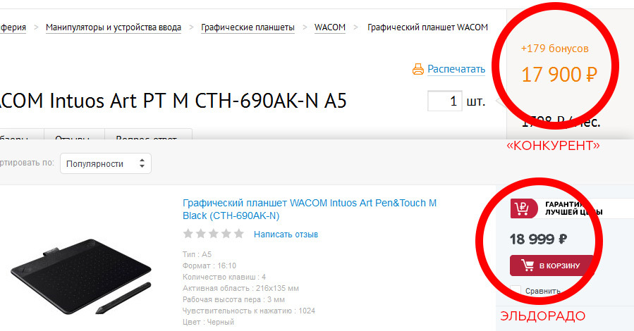 Нужен планшет определенной модели и есть некоторое количество бонусов, которые бы являлись отличной скидкой при его приобретении. Смотрим цены. Согласно яндекс-маркету у Эльдорадо вполне пристойная цена (16 459 руб., можно проверить самостоятельно, если есть желание). Однако, выбираем домашний ренион на сайте эльдорадо (Псковская область) и бабац, цена вырастает до неприятных 18 999. Окей, у нас же есть «Гарантия лучшей цены»