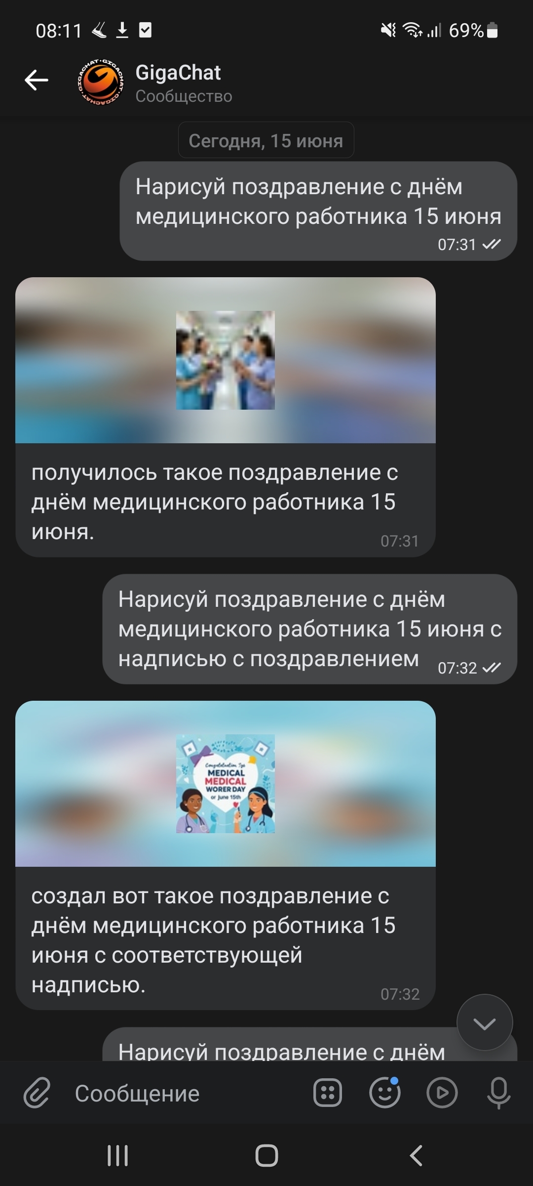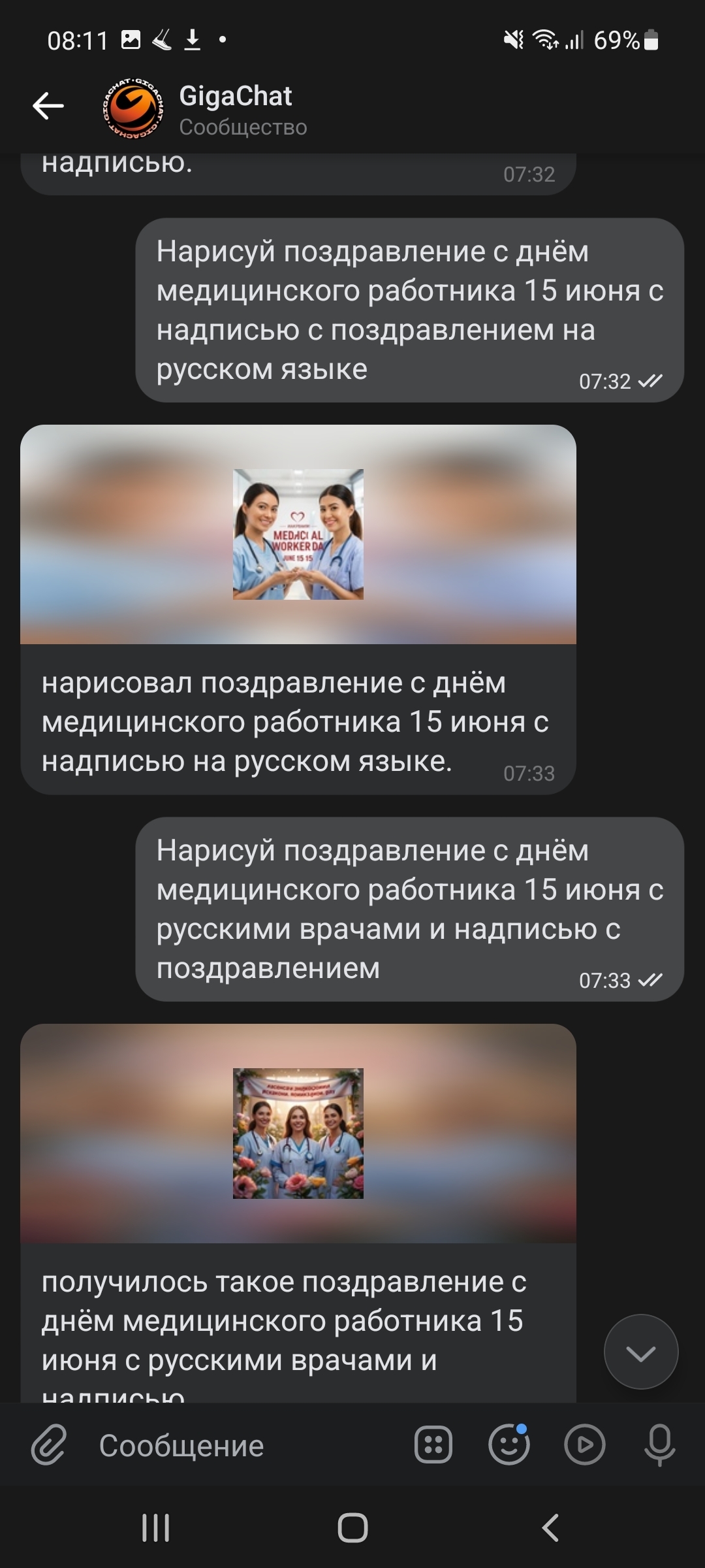 Сегодня День медицинского работника. Попросила ГигаЧат в вк создать поздравление, писала несколько запросов, выдаёт сначала мулатов и азиатов, на запрос с русскими врачами выдал адекватную картинку, но надписи на русском так и не получилось! Вот запросы: