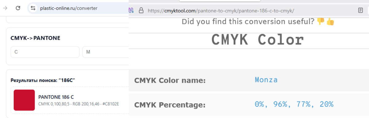 И тут многие обманываются, думая, что эти модели можно напрямую конвертировать между собой. И в интернетах даже присутствует некоторое количество онлайн конвертеров. Устроим им очную ставку. Вот есть у нас для примера Pantone 186C. И дизайнер считает, что это CMYK 0 100 81 4.