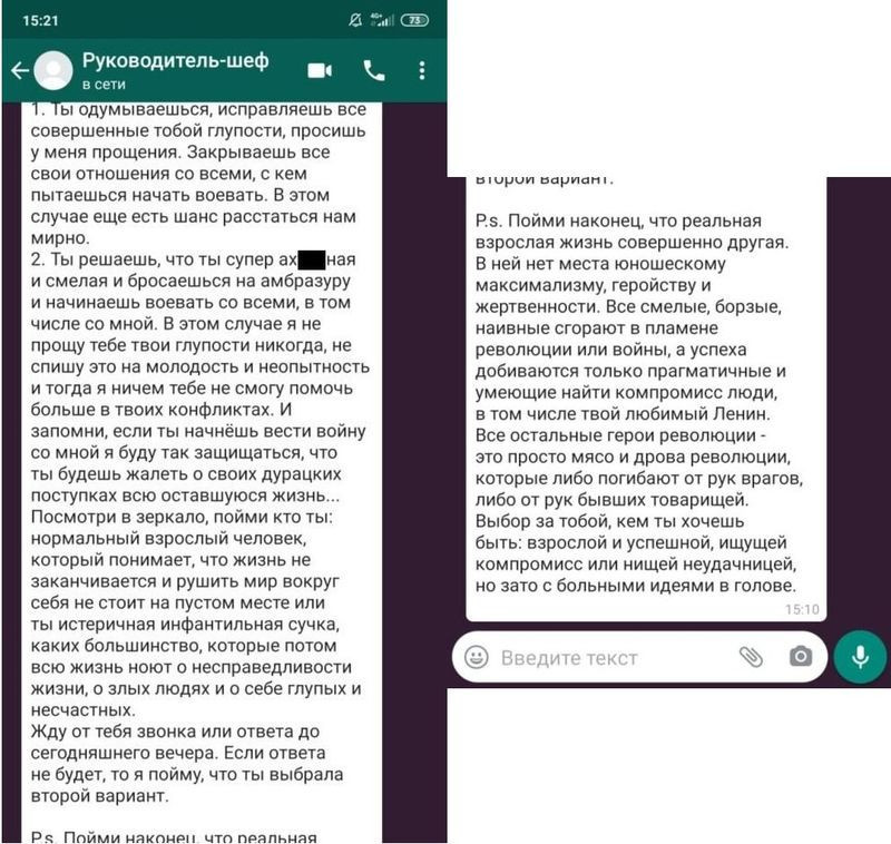 Разумеется, капиталисты не успокоились. Когда девушка вновь вышла на работу, её – напомним, юрисконсульта – не допустили на рабочее вместо и вновь попытались поставить у входа, чтобы мерить температуру посетителям. Тогда Виктория написала заявление «по собственному», но предварительно вызвала полицию, чтобы зафиксировать недопуск на рабочее место. Конечно, любой здравомыслящий человек откажется работать в подобном заведении и на таких условиях. Бороться стоило, прежде всего, ради защиты своей чести и достоинства, ради торжества справедливости. И в итоге Виктория добилась своего благодаря собственному упорству, принципиальности и помощи товарищей.