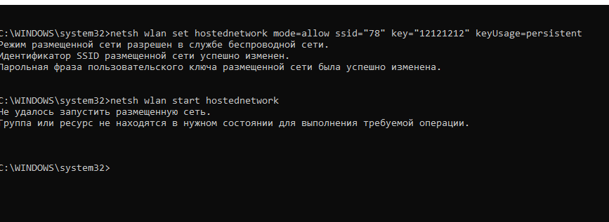 UPD: После перезагрузки компьютера, нужно будет каждый раз запускать сеть командой netsh wlan start hostednetwork.