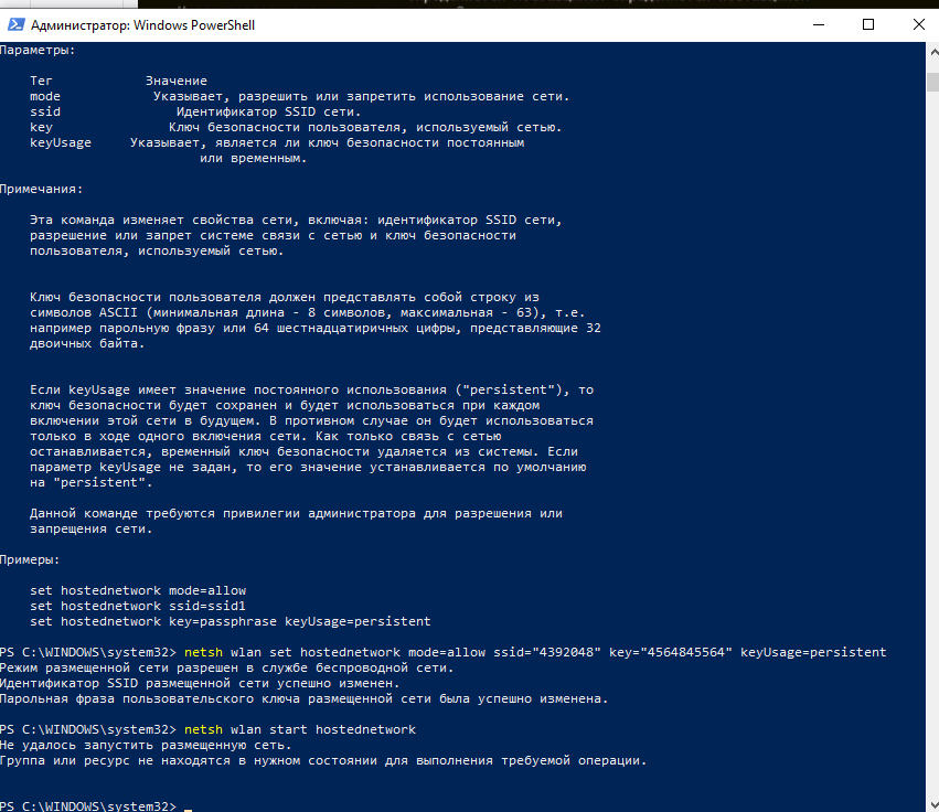 netsh wlan set hostednetwork mode=allow ssid="название" key="пароль" keyUsage=persistent