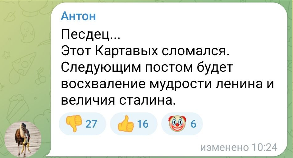Есть такое дело. Собственно, поэтому Путину бы начать себя постепенно за скобки выводить, чтоб мы после его внезапной смерти не получили какого-нибудь вообще не готового и не отдупляющего, например, Золотова. Который такой "так, я все 25 лет строил карьеру на том, что я верный и не задаю вопросов. И теперь хуле мне со всем этим делать? Кому тут ебало надо разбить, чтоб всё работало?". Ну и после Золотова, когда он разобьет ебало Трампу, засадит поля кукурузой и отправит собаку в космос чисто по приколу, придет чёт уровня Беглова. Номенклатура заебётся от приколов вождя и посадит кого потише, кто будет примус починять и не вмешиваться. И страна вроде выдохнет, но немедленно начнет гнить. Потомушта Беглов будет сидеть и не делать ничего, в общем и целом. Играя в чисто оборонительную пассивную страту. И мы с ним или сразу после него обязательно влетим в какой-нибудь жир, по логике исторического процесса. Где это "какбычегоневышло" нас и погубит.