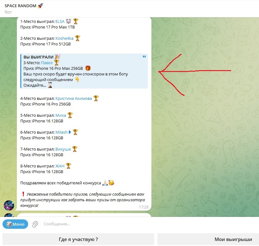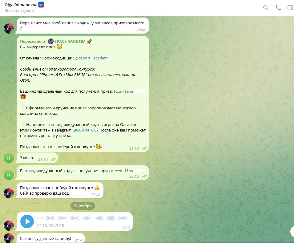 Всё началось с того что искал промокоды для озона. Попал на группу "промокодница" в телеге, а там как раз вот такой конкурс - типа подпишись, нажми участвую и жди победы. Ну, думаю, ладно, халява чо, денег не просят (пока), кнопку нажать. Нажал ну и забыл конечно про всё это, ни на че не надеялся изначально. Проходит время около недели примерно, приходит сообщение от бота вчера - ебать, вы выиграли огромный айфон.