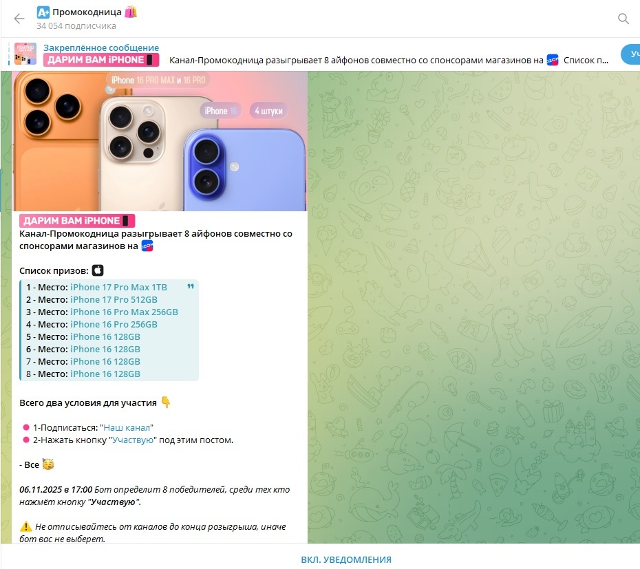 Наверняка видели такие розыгрыши в группах в телеге, типа подпишись, нажми "участвую", выиграй айфон/пылесос/кошкожену и так далее. В крупных серьезных группах, типа Озона, Авито, Вилсакома, это еще может как-то и возможно, но сегодня расскажу как разводят в более мелких.