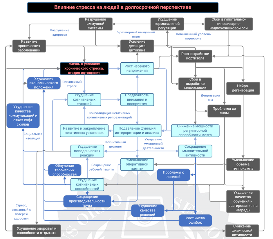 На схеме светло-голубыми блоками отмечено влияние стресса на человека в первой стадии, стадии, когда организм отвечает на повышенное давление мобилизацией своих сил. Уже за первые 4 недели регулярного стресса человек теряет в когнитивных функциях, способности анализировать, воспринимать информацию, мыслить, расплачивается ростом нервного напряжения.