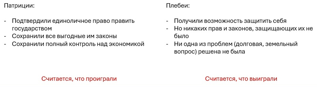 Хотя может показаться, что плебеи многого добились — на деле, на мой взгляд, всё таки победа была на стороне патрициев. Ведь соглашение с плебеями фактически подтвердило доминирование патрициев в политике. Они составляли большинство в сенате, они же контролировали выборы магистратов, благодаря чему на эти должности тоже проходили исключительно патриции. Основные жреческие коллегии тоже остались патрицианскими, что давало им контроль и над трактовкой законов и обычаев. Плебейские трибуны не были встроены в эту систему, не имели в рамках патрицианского государства никаких рычагов власти.
