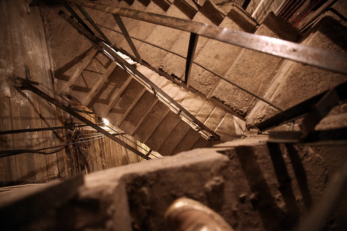 Оглядываемся по сторонам. Внутри нет ничего героического. Уходящая вверх узкая лестница с прямыми маршами, электрическая проводка, металлическая арматура и лампочки, испускающие слабый свет.