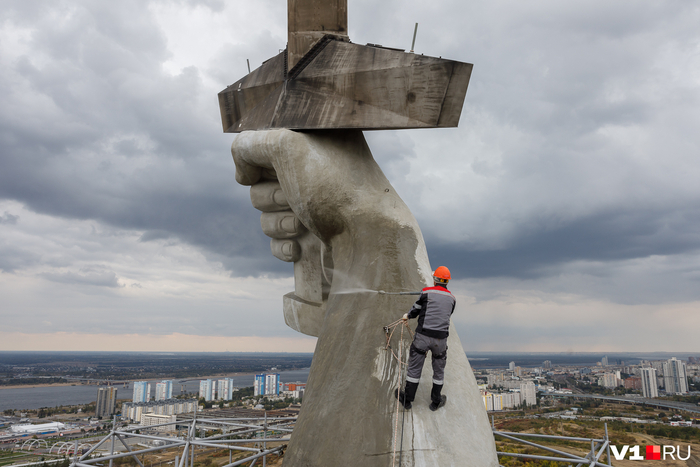 В отличие от американской Статуи Свободы, где внутри есть смотровая площадка и окна, в голове Родины-матери ничего такого нет. Как нет и VIP-ресторана для важных персон, о котором глаголет народная молва. Просто сфероподобное помещение с деревянным полом-настилом и маленькой лестницей, ведущей на макушку головы. Итак, делаем ещё одно усилие над собой, и вуаля – мы на вершине головы! Перед нами открывается отличный вид на мемориальный комплекс и город Волгоград.